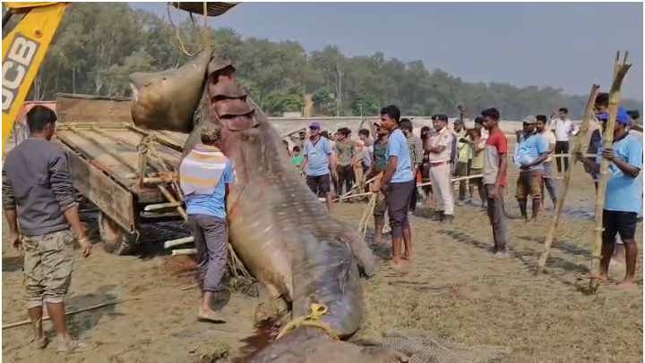 নিজস্ব সংবাদদাতা :: সংবাদ প্রবাহ :: বালেশ্বর :: শুক্রবার ৫,ডিসেম্বর :: ওড়িষ্যার বালেশ্বর জেলার ভোগরাই ব্লকের তালসারী সমুদ্রতটে উঠে এল এক বিশাল হাঙ্গর। প্রায় ৩০ ফুট লম্বা ও ৫০ কুইন্টালের বেশি ওজনের মৃত হাঙ্গরটি জালে আটকে পড়ে বলে জানিয়েছেন মৎস্যজীবীরা।