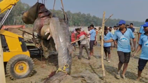 নিজস্ব সংবাদদাতা :: সংবাদ প্রবাহ :: বালেশ্বর :: শুক্রবার ৫,ডিসেম্বর :: ওড়িষ্যার বালেশ্বর জেলার ভোগরাই ব্লকের তালসারী সমুদ্রতটে উঠে এল এক বিশাল হাঙ্গর। প্রায় ৩০ ফুট লম্বা ও ৫০ কুইন্টালের বেশি ওজনের মৃত হাঙ্গরটি জালে আটকে পড়ে বলে জানিয়েছেন মৎস্যজীবীরা।