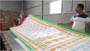 শাড়ির উপর ফুটে উঠছে দলীয় প্রতীক, স্লোগান, এমনকি নেতাদের ছবিও। তাঁত শিল্পীদের দাবি, ভোট এলেই এমন বরাত আসে। তবে এবারের অর্ডার কিছুটা বেশি, ফলে বাড়তি লাভের আশায় দিনরাত কাজ করছেন তারা।