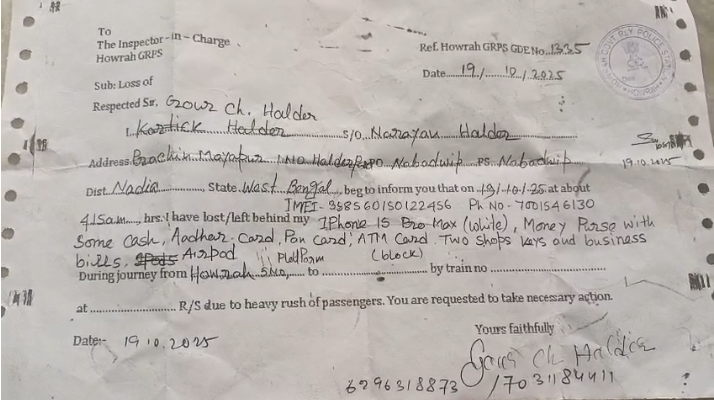 নদিয়ার নবদ্বীপ থানার প্রাচীন মায়াপুরের বাসিন্দা গৌর চন্দ্র হালদার গত ১৯ অক্টোবর ভোরে নবদ্বীপে তার বাড়ি ফেরার জন্য হাওড়া স্টেশনে বসেছিলেন ট্রেন ধরবেন বলে। ঠিক সেই সময় অপরিচিত এক ব্যাক্তি নিজেকে পুলিশ পরিচয় দিয়ে গৌর বাবুর সম্পর্ক স্থাপন করেন।