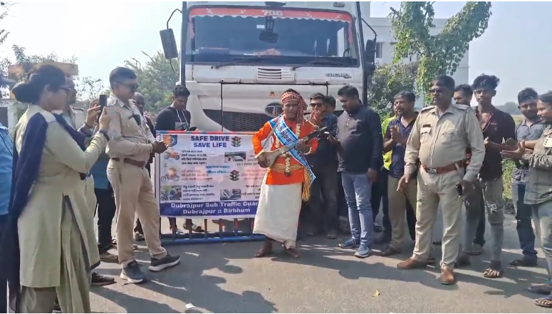 দুবরাজপুরের দরবেশ মোড়ের কাছে রানীগঞ্জ-মোরগ্রাম ১৪ নম্বর জাতীয় সড়কে সাধারণ মানুষকে সচেতন করতে বাউল গানের মাধ্যমে হেলমেটের প্রয়োজনীয়তা, নেশাগ্রস্ত অবস্থায় গাড়ি না চালানো,
