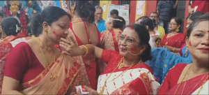 নিজস্ব সংবাদদাতা :: সংবাদ প্রবাহ :: কোন্নগর :: শনিবার ৪,অক্টোবর :: পুজোর যে চার দিনের আনন্দ সেই আনন্দকে ভুলিয়ে এখন মানুষের মনে বিষাদের সুর। কারণ উমা পাড়ি দেবেন আবারও কৈলাসে। সকাল থেকে হুগলির কোন্নগরে ঘোষাল বাড়িতে শুরু হয়েছে দেবীকে বরণ করার পালা।বরণ করে সিঁদুর পরিয়ে মাকে নিয়ে যাওয়া হবে বঙ্গভক্তি নিরঞ্জনের পথে। বাড়ির মহিলারা সাদা শাড়ি লাল পাড় মাথায় ঘোমটা দিয়ে ঠাকুরের বরণ করলেন সবাই মিলে একসঙ্গে মেতে উঠলেন সিঁদুর খেলায়
