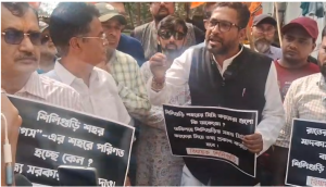 পোড়াঝাড়ে ভূমি হারাদের অবস্থান বিক্ষোভে মেয়র গৌতম দেব