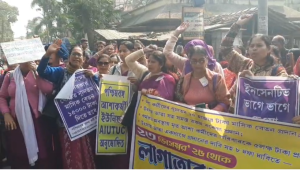 মাসিক বেতন সহ আট দফা দাবি নিয়ে কর্ম বিরতি রেখে বিক্ষোভ আশা কর্মীদের।