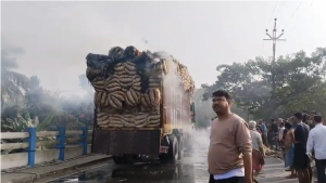 পাটবোঝাই চলন্ত ট্রাকে ভয়াবহ আগুন, আতঙ্কিত বাসিন্দারা